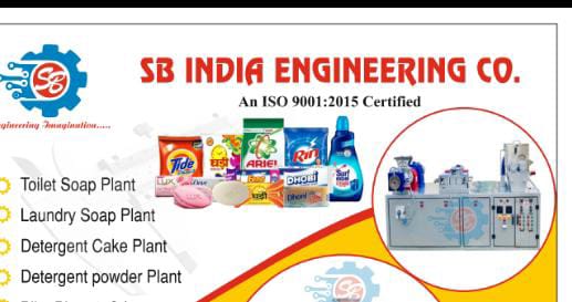 Established in year 2010, SB India Engineering Co. prominent Manufacturer and Exporter is ISO 9001:2015 certification, which is also the reason of its growing popularity in the industry. Our ISO certified manufacturer and exporter company deals in quality built line of detergents and soap production plants. We have Detergent Powder Mixer Ribbon Blinder, Auto Stamp Machine Detergent Cake, Pneumatic Bar Cutter, Soap Screw Conveyor and related machines in our portfolio to support fast production of soaps and detergent cakes & powder, in a prompt manner. Of the total products that we produce, 50% are exported, that too at industry best prices. We are admired for providing soap manufacturing Consultancy and Repairing Service after sales, as a part of our customer satisfying policy.